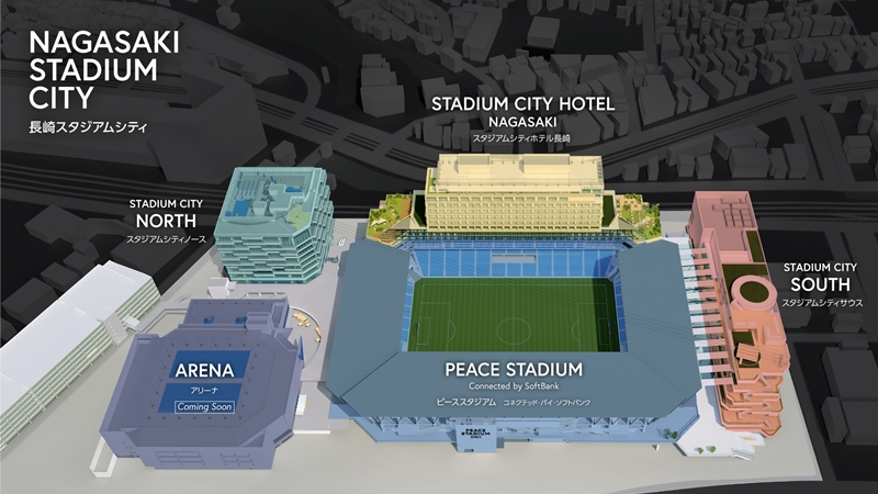 今回発表されたのはスタジアムに併設される3施設の名称。ホテル棟の名称は「STADIUM CITY HOTEL NAGASAKI(スタジアムシティホテル長崎)」、商業棟は「STADIUM CITY SOUTH(スタジアムシティサウス)」、オフィス棟は「STADIUM CITY NORTH(スタジアムシティノース)」に決定した。