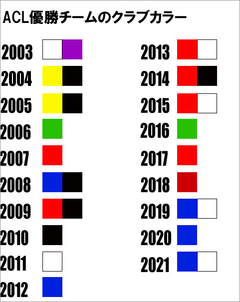 両者のクラブカラーは赤(浦和)と青白(アル・ヒラル)だが、歴代ACL優勝チームのクラブカラーはどうだったのか。そこで現在の「AFCチャンピオンズリーグ」に改称後の優勝チームの色を調べてみた。