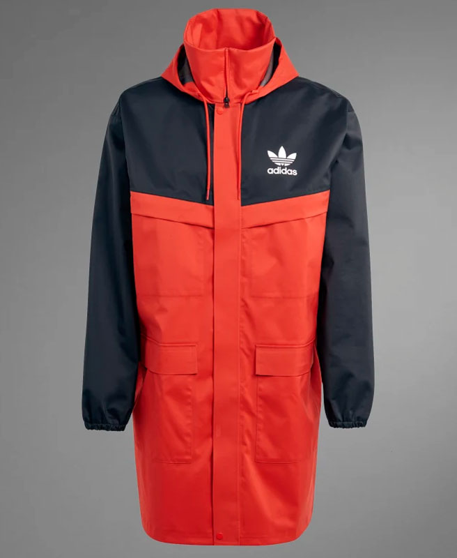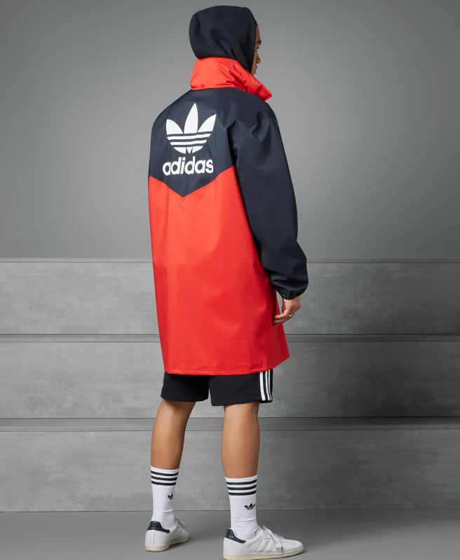 チームカラーのレッドとブラックで構成するベンチジャケット。左胸と背中にトレフォイルを配し、内側にユナイテッドのエンブレムをプリントする。フードは折りたたんで収納が可能。