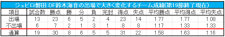 『ジュビロ磐田 DF鈴木海音の出場で大きく変化するチーム成績』(作成:筆者)