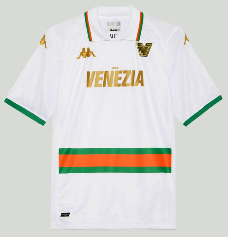 23-24新アウェイユニフォームはヴェネツィアのライフスタイルに敬意を表し、ホワイトを基調とした中にオレンジとグリーンのストライプを配するスタイリッシュなデザイン。ホームに続きこちらもファッション性の高い仕上がりだ。