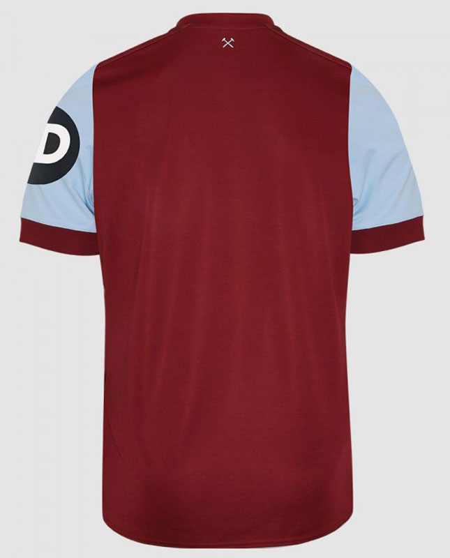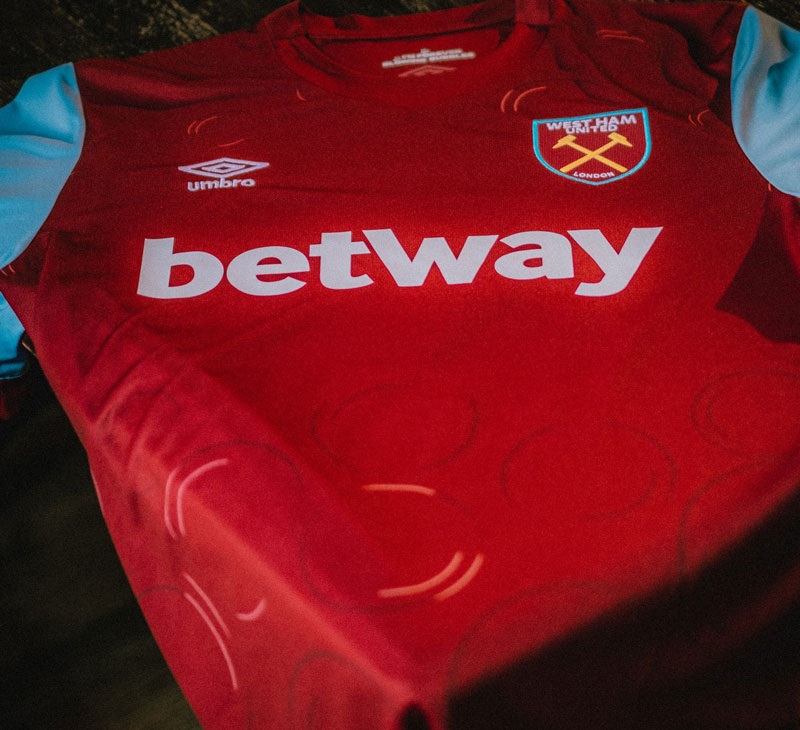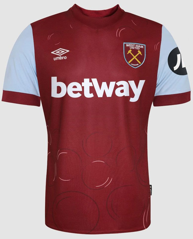 “アンセムキット”と命名された23-24新ホームユニフォームは、クラレット(ワインレッド)を基調にスカイブルーの伝統的なコンビネーション。だが、所々に浮かぶバブルグラフィックがいつものハマーズのユニフォームとは異なる印象を与える。