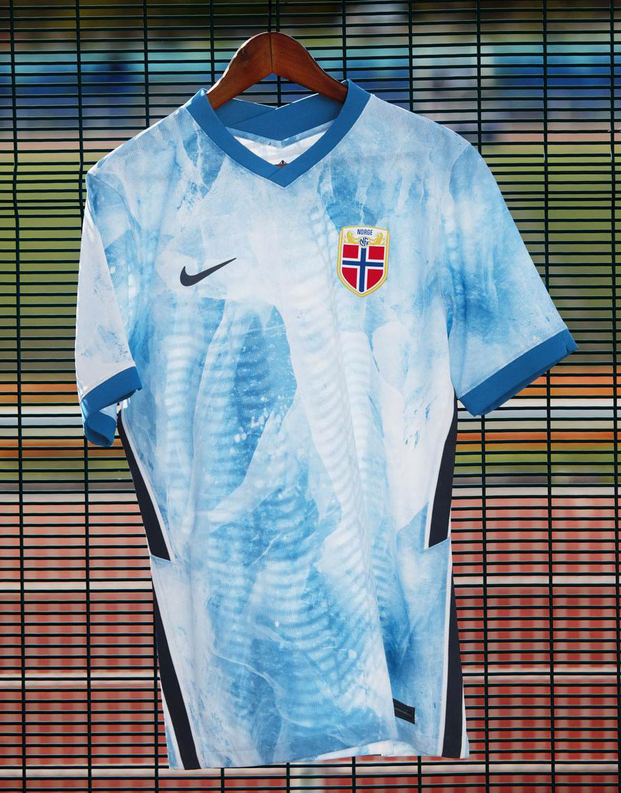EURO2020に向けて作られたノルウェー代表のアウェイユニフォーム。北欧の気候を感じる冷涼感たっぷりのデザインは、ノルウェーの風土を象徴する氷山を描いたもの。