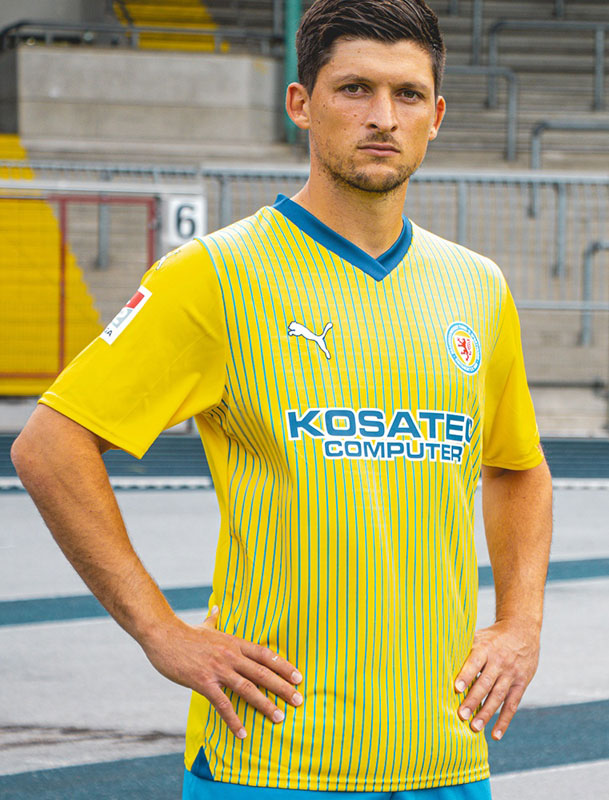 23-24新ホームユニフォームは、ブラウンシュヴァイク伝統のイエロー/ブルーによるデザイン(この色については後述)。22-23シーズンは稲妻模様のような大胆なグラフィックを採用していたが、今回はクラシックなピンストライプ柄が登場した。