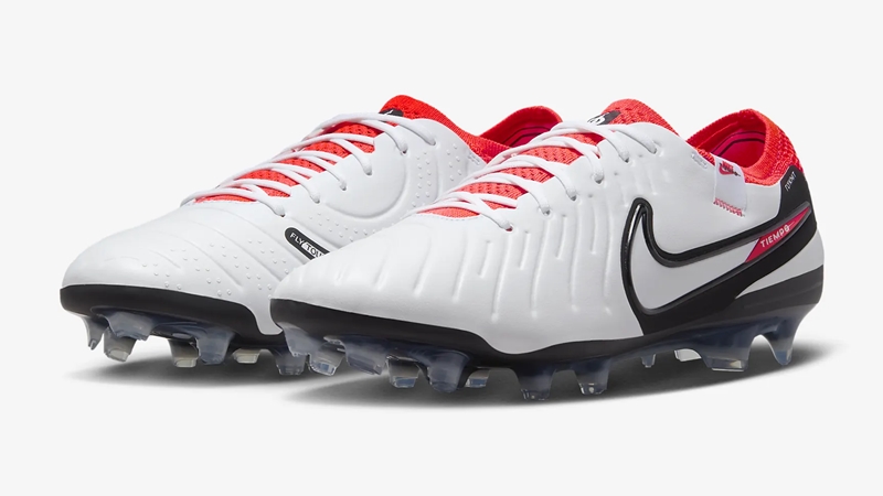 アッパーが合成皮革フライタッチプラスに変更された『ティエンポ レジェンド 10』の新色はホワイト/ブラック/ブライトクリムゾン。