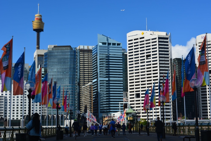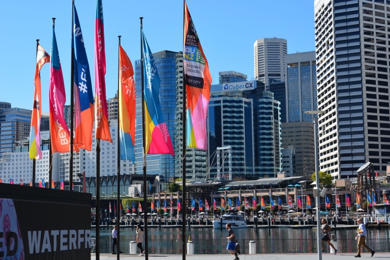 目に飛び込んでくるのは大会ビジュアルをあしらったフラッグ。多様性を連想する不規則でカラフルなデザインが鮮やかだ。シドニー観光の主要なポイントの1つであるダーリングハーバーは湾を囲むようにフラッグが並ぶ。湾を横断する橋の両側にもフラッグが連なるようになびいている。