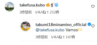 また、南野がSNSを更新すると久保建英も絵文字で反応。南野はそれにバモスと返信していたぞ。