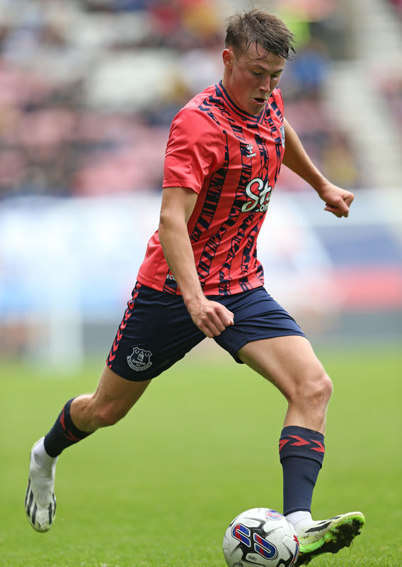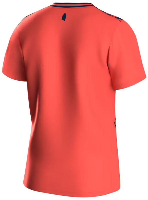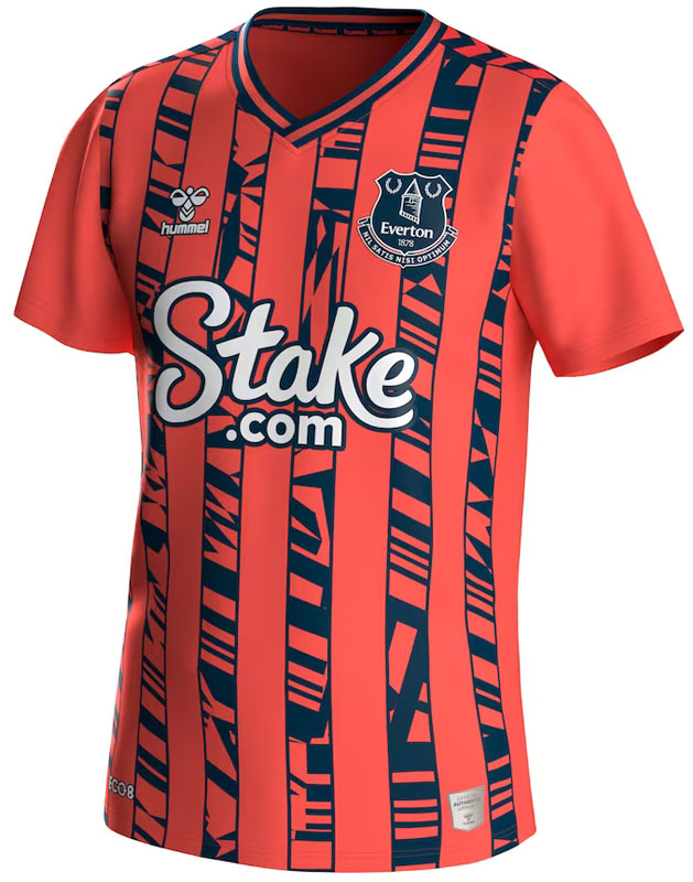23-24新アウェイユニフォームは、古くからエヴァートンを知る人には懐かしさを覚えるデザイン。コーラル(珊瑚色)とネイビーのストライプを基調に、ネイビー部分には幾何学的な模様を落とし込む。