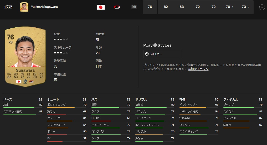 スピード82、シュート53、パス72、ドリブル72、守備70、フィジカル73