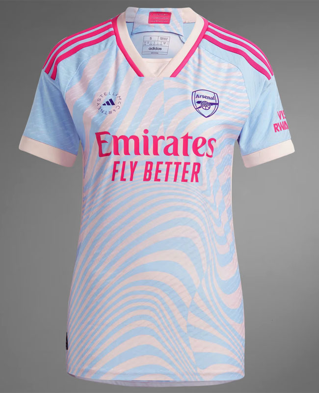 女子チームのアウェイにしてクラブ史上初の女子専用ユニフォームは、幾何学的なウェーブグラフィックが独特。ハローピンクとグローブルーのカラーブロッキングが鮮烈な印象を与えるデザインだ。