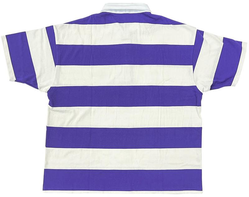 チームカラーの紫に白を組み合せたボーダー柄がクラシックなラガーシャツ。左胸にエンブレムを装着する。どことなく英国的なデザインがかっこいいぞ。