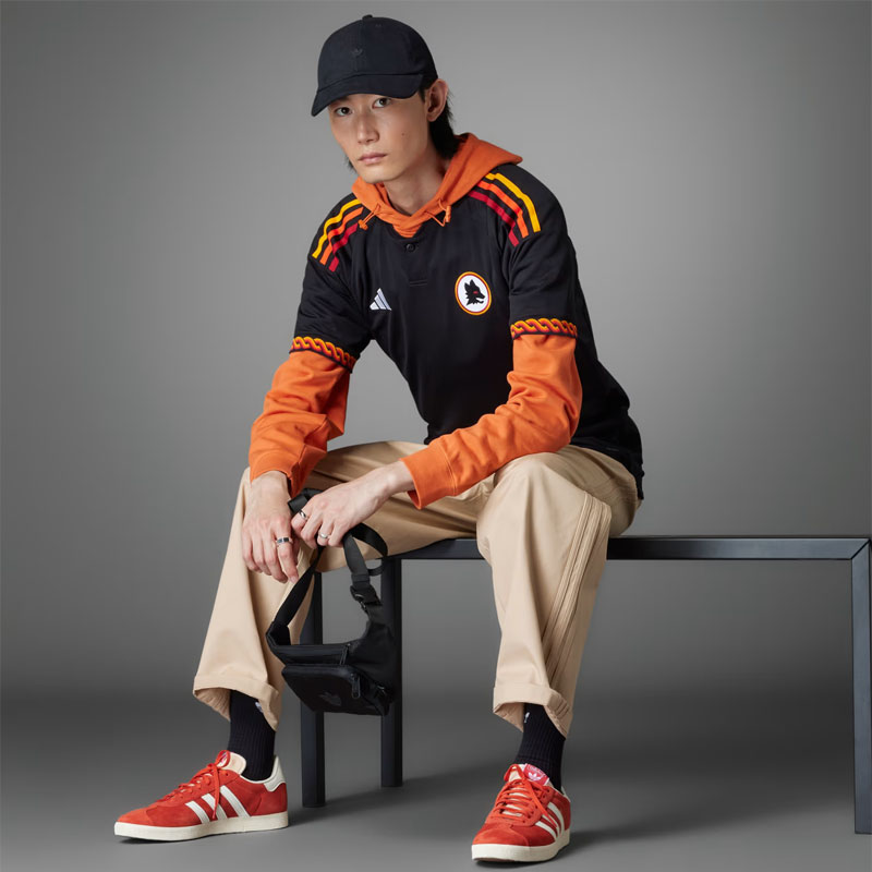 最近発表されたばかりの今季サードユニフォーム。ローマでは定番カラーのブラックをベースに使ったシンプルなデザインで、袖のスリーストライプスの3色が絶妙なコンビネーション。