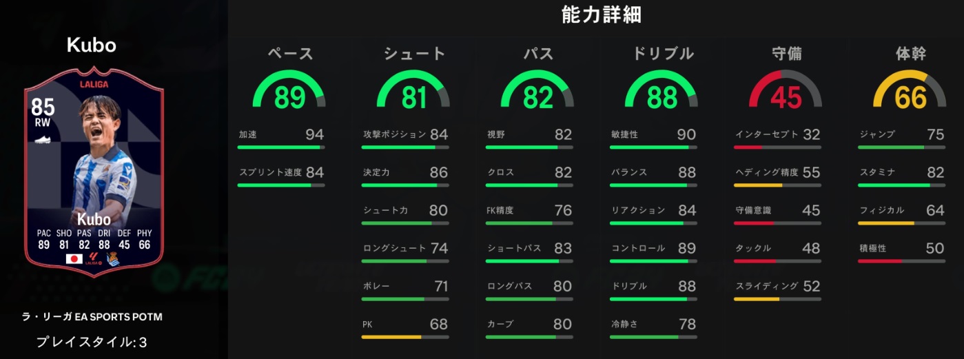 スピード89、シュート81、パス82、ドリブル88、守備45、フィジカル66