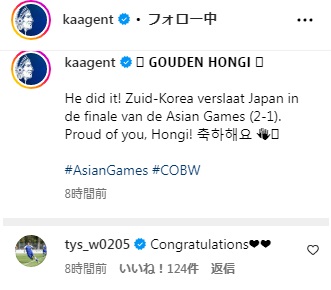 韓国代表の一員であるホン・ヒョンソクが所属するヘントは、Instagram上で優勝を祝福している。