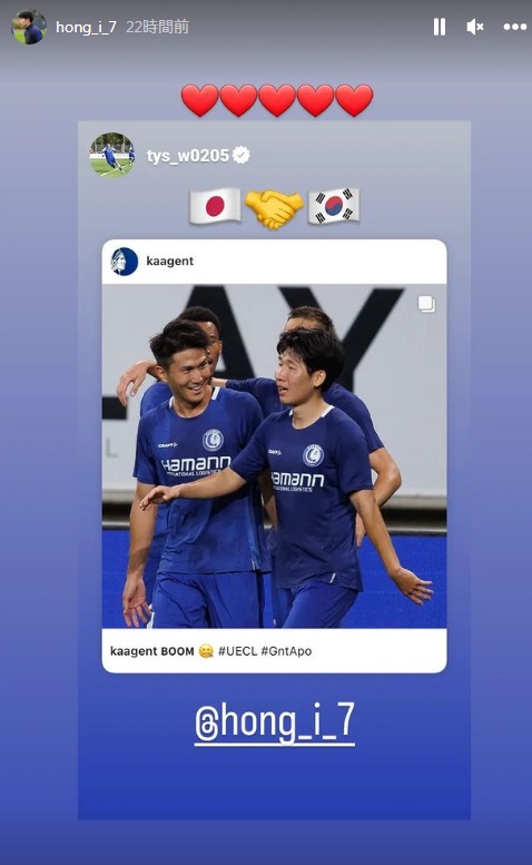 渡辺は今季ヘントに移籍したばかりだが、ホン・ヒョンソクのアシストからゴールを決めるなど2人は仲良し。8月にはこんな投稿もしている。