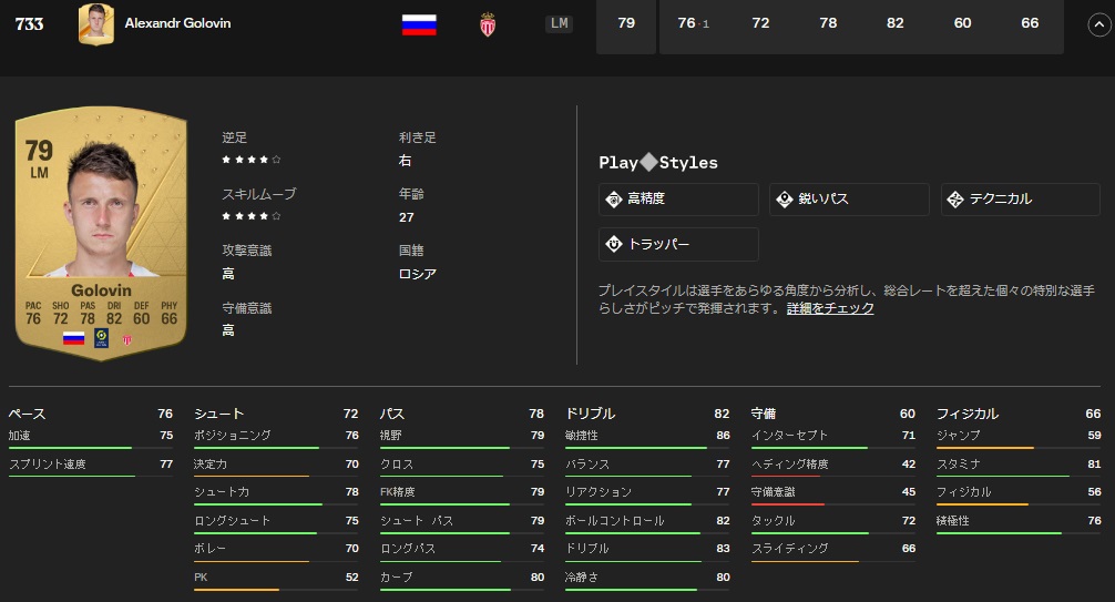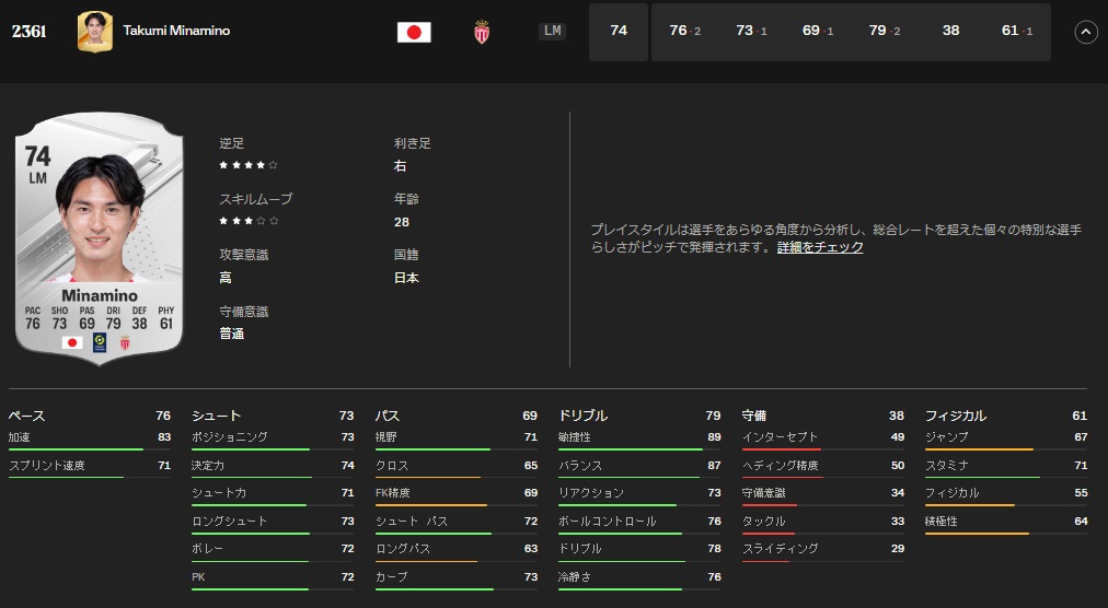 スピード76、シュート73、パス69、ドリブル79、守備38、フィジカル61