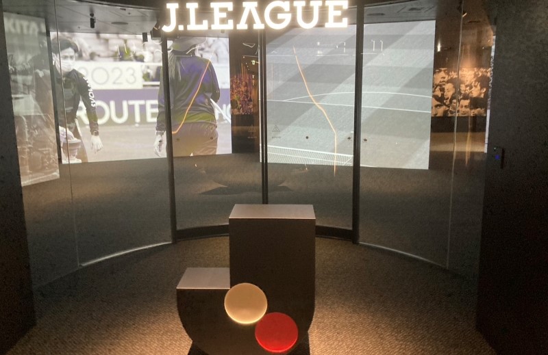 オフィスを訪問するとJリーグのロゴのモニュメントが中央に設置されてあり、エントランス内ではJリーグクラブの様々な画像を映すパネルなどが出迎えてくれる。