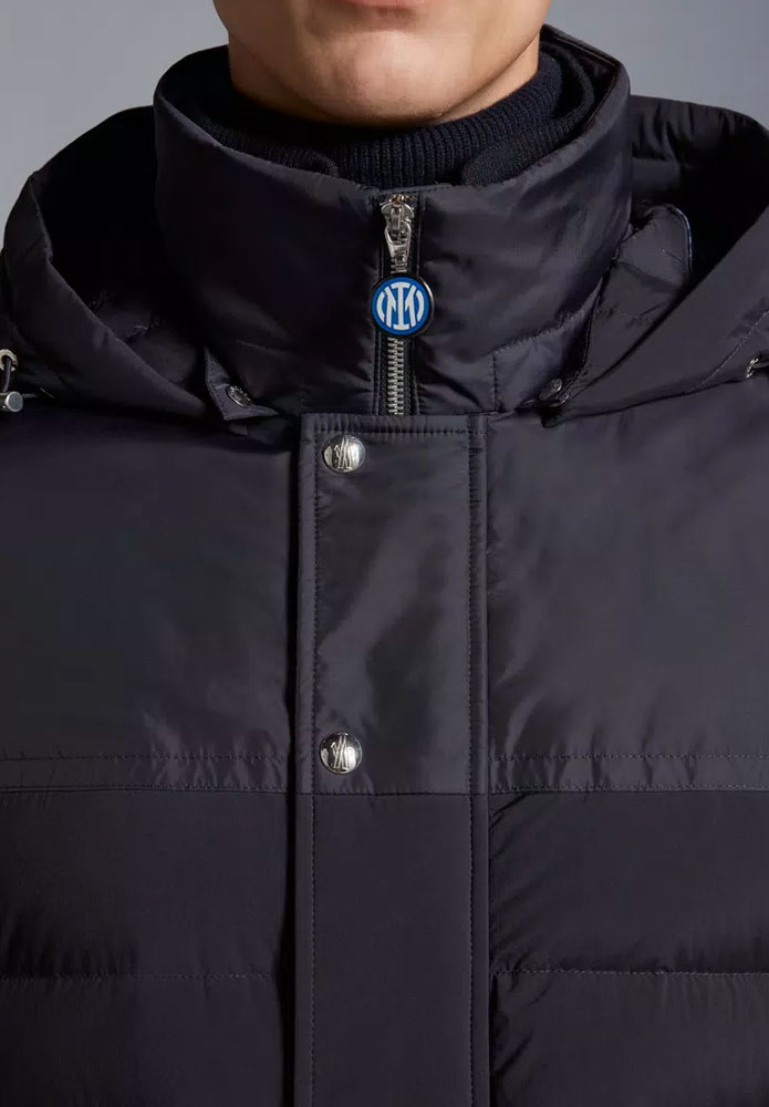 撥水加工されたナイロン製のショートパファー。インテルのロゴが裏地全体にあしらわれ、両ブランドのロゴパッチが袖を飾る。