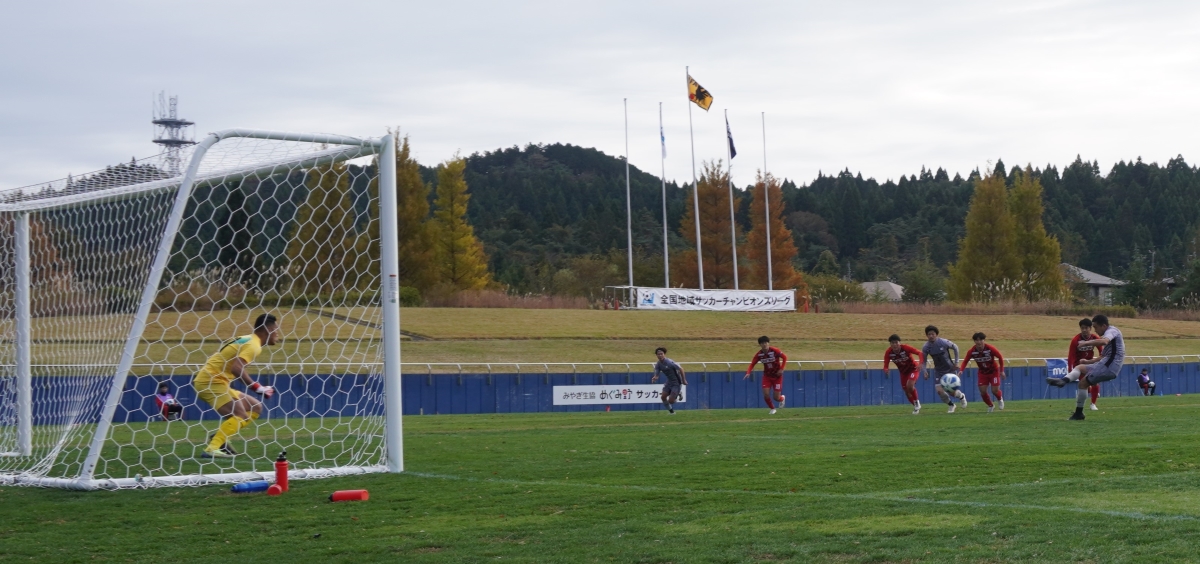 前半12分にPKを獲得したwyvern。ガイナーレ鳥取、栃木SCなどでプレーしたFW山本大稀が右足でゴール左隅を突き刺して先制点を奪った。