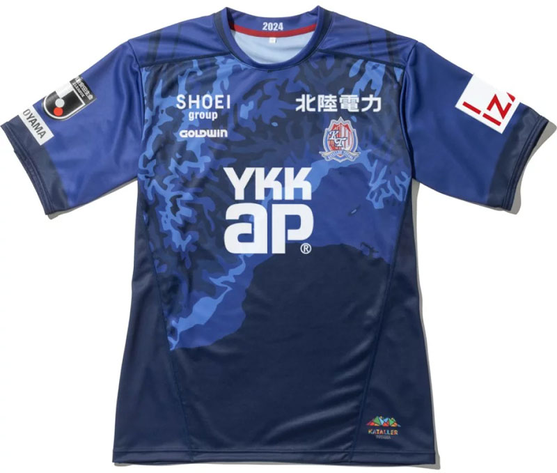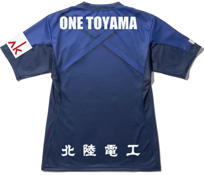 ホームユニフォームは、3,000m級の山々が連なる立山連峰から水深1,000mを越える富山湾まで、起伏に富んだ富山の地形の等高線を濃淡ブルーの迷彩柄にアレンジし『強さ』を表現。