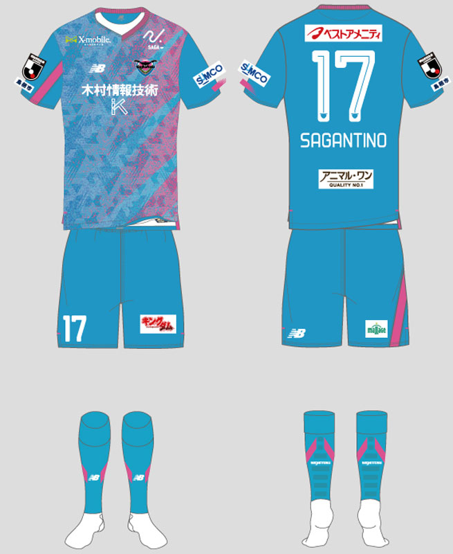 パンツとソックスを含めたコンプリートルックは、2023シーズンと同様にサガンブルーでまとめるスタイル。パンツにもサガンピンクの斜めストライプを走らせる。