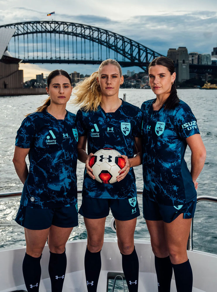 23-24新サードユニフォームはダークネイビーを基調にアクアブルーを組み合せ、ホームタウンのシドニーの象徴で街の中心とも言えるシドニー港にインスピレーションを得たデザイン。