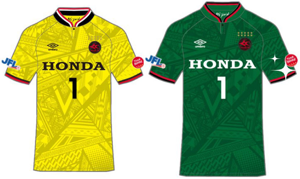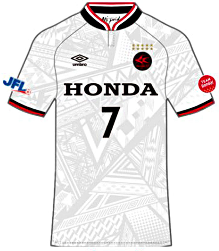 新アウェイユニフォームは引き続きホワイトを基調に、ホームと同じレトロなUmbroユニフォームの柄模様を採用。Honda FCは企業クラブとしての姿勢を貫くだけに、シャツのスポンサーは当然ながら「HONDA」一社となる。
