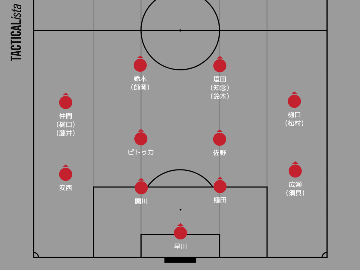 センターバックは昌子源が今季大きく成長した関川をバックアップし、サイドバックは佐野海舟が試合途中から務めつつ、須貝が両サイドに対応した。