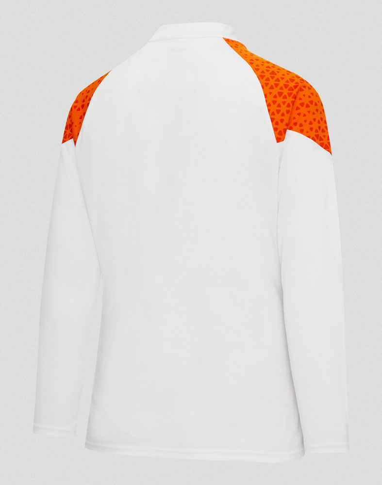 選手がトレーニング時などに着用するラグランスリーブ構造のウェア。胸元はジッパー仕様で着脱が容易に。サッカーのトレーニング用はもちろん、ジョギングなど屋外でのワークアウトにも使える。