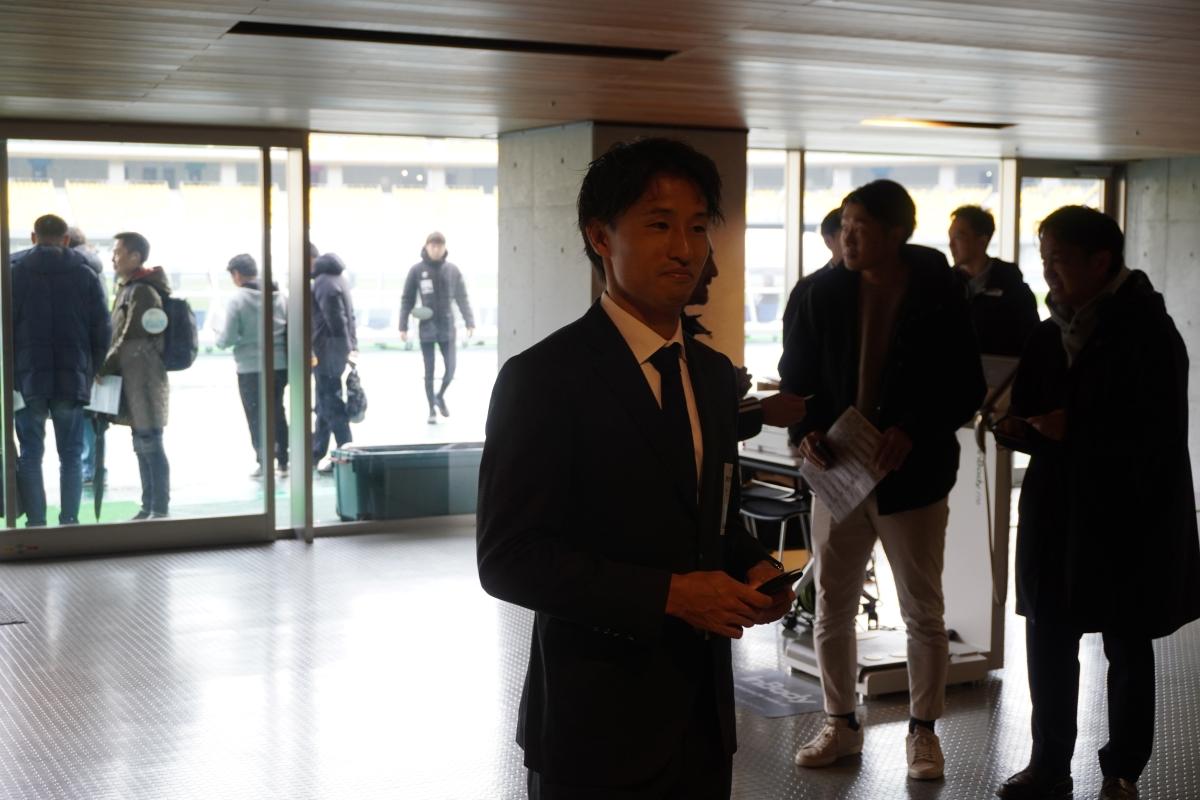 今季はリーグ戦27試合に出場するも、先発は7試合に留まった。それでも3アシストを記録してチームに貢献してきた中盤、右サイドバックもこなせるユーティリティプレーヤ―は、慣れない名刺交換も軽快にこなした。