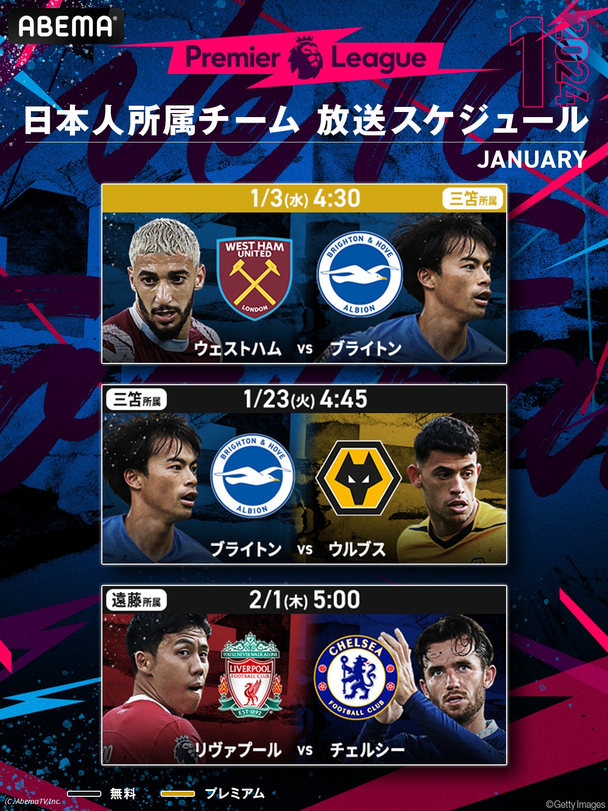 ■「ABEMA」 「プレミアリーグ 2023-24シーズン」 2024年1月放送スケジュール