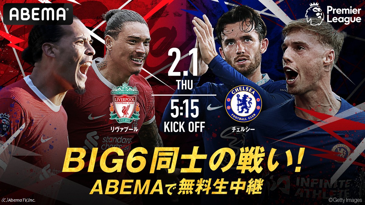 さらに、「ABEMA」にて「リヴァプールvsチェルシー」や「マンチェスターU vsトッテナム」などのBIG6同士の対決を生中継。アーセナルとリーグ首位争いを繰り広げるリヴァプールの負けられない一戦や、好調トッテナムと上位チームをじわじわと追い詰めるマンチェスターUとの対決など見逃せない強豪クラブ同士の試合を、ぜひ「ABEMA」でご覧ください。