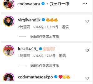 これにチームメイトたちも反応!フィルヒル・ファンダイク、ルイス・ディアス、コーディ・ガクポはこんな絵文字を送っていた。