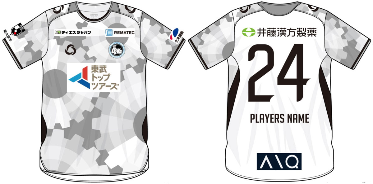 新アウェイユニフォームはホワイトとグレーの2色による歯車デザインに。背中のネームナンバーは2024シーズンよりboneraのオリジナルフォントを使用する。