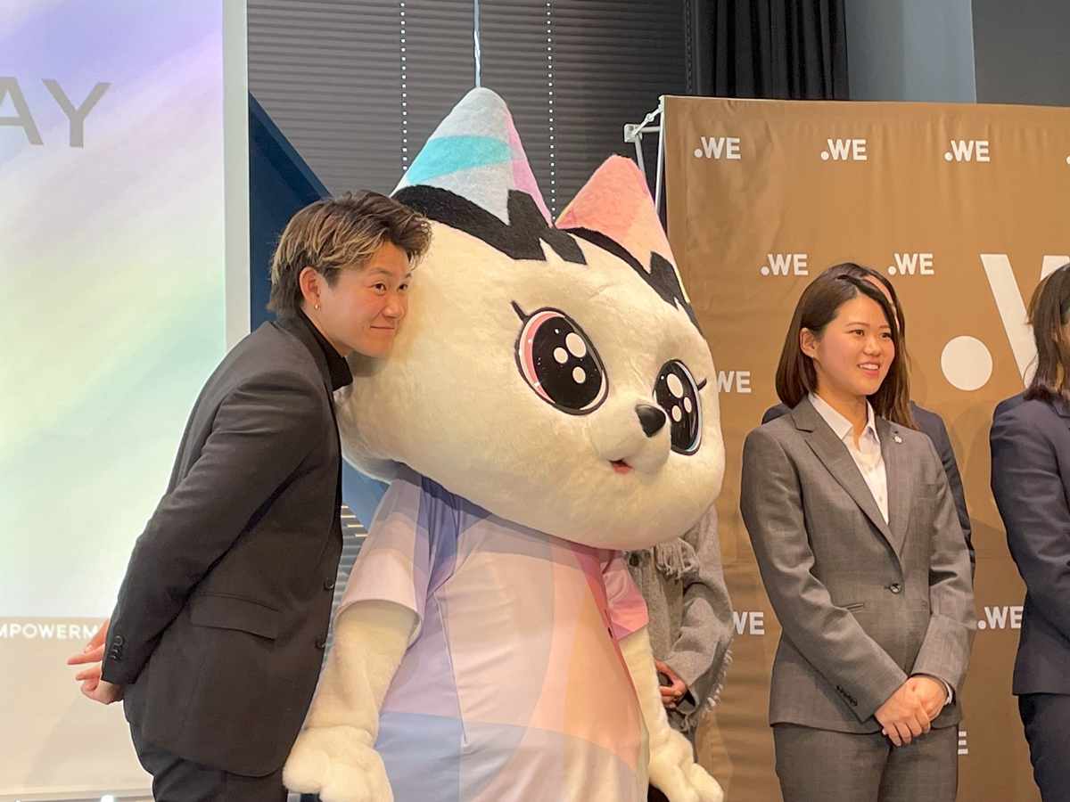写真撮影で、WEリーグのマスコット「ウィーナ」にすり寄る山下。