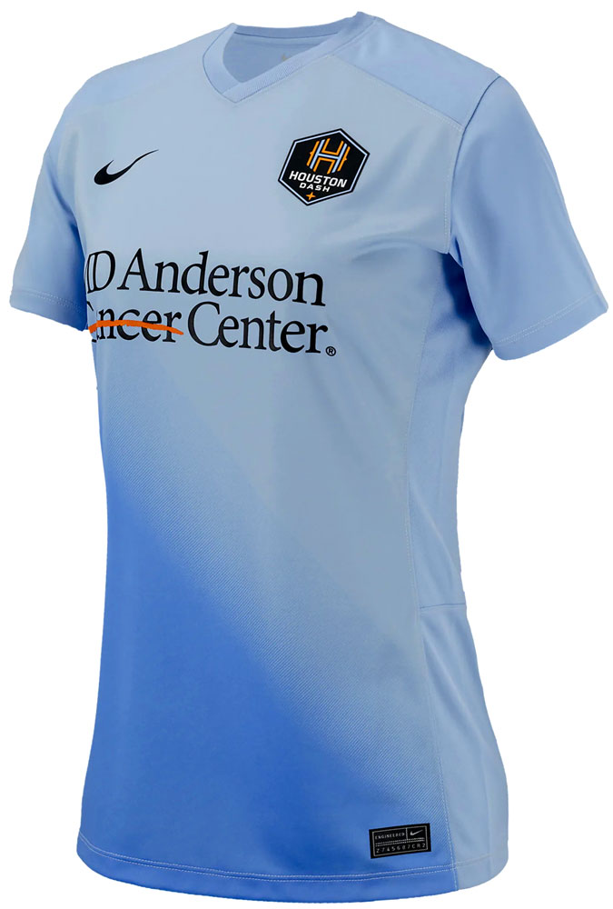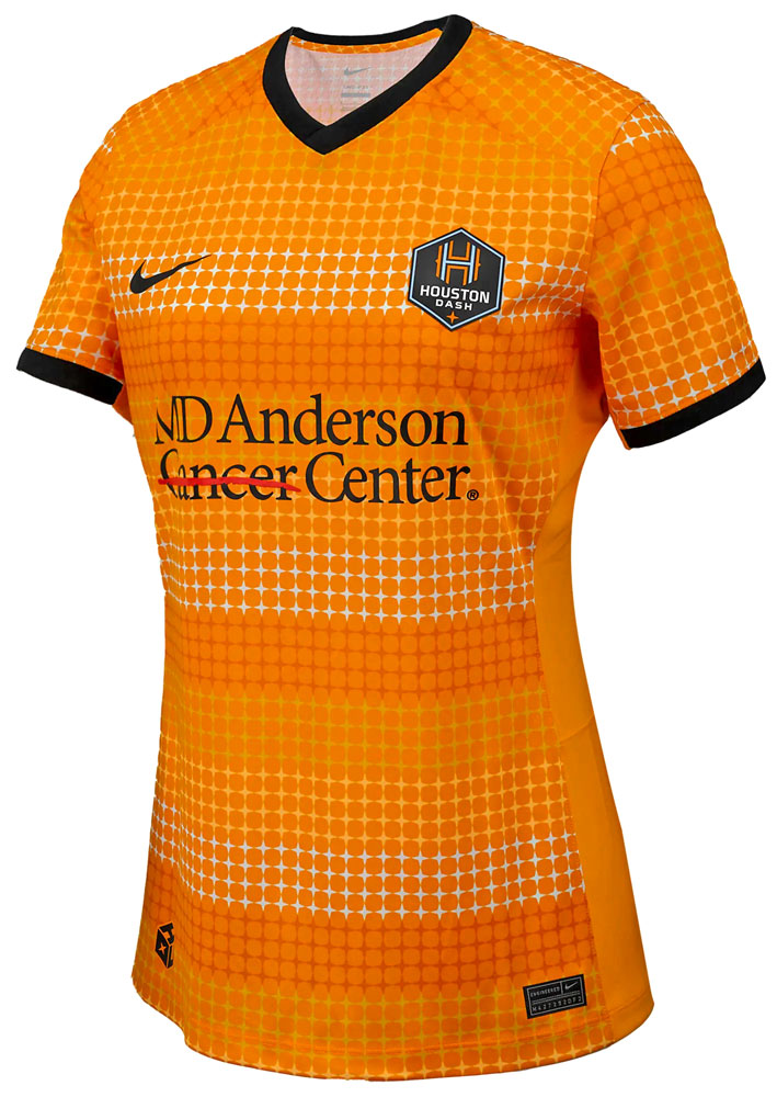 シャツの右裾にはエンブレムの形をした“HOU”ロゴをデザインする。これはホームタウンのヒューストンにある「ウィリアム・P・ホビー空港」の空港コード。中心にクエーサーを配しアルファベットの“X”に見立てた文字「O」で、ローマ数字の“10”を表現しクラブの10周年を祝う。