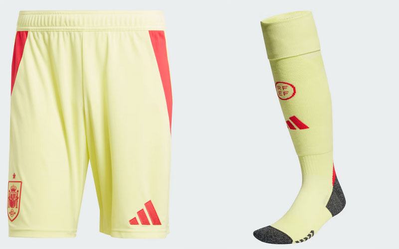 新アウェイユニフォームは衝撃カラーが登場した。この基調色を見た印象そのままに表現するなら、クリームイエローといったところだろうか。そこにレッドとスカイブルーを組み合せるという、スペイン代表史上初の恐れ知らずで大胆なキットカラーが完成した。
