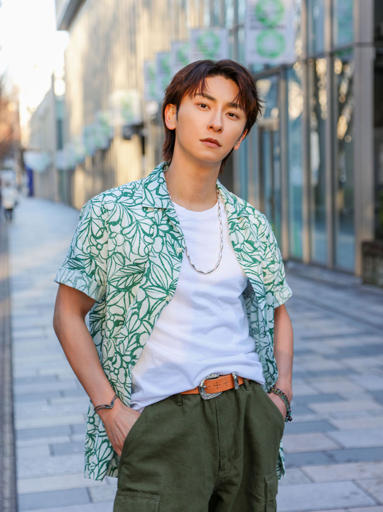 AAA(トリプル・エー)の與真司郎さんは、リネンのプリントシャツとリネンカーゴパンツを着用したグリーンを基調とする爽やかなスタイルを披露。