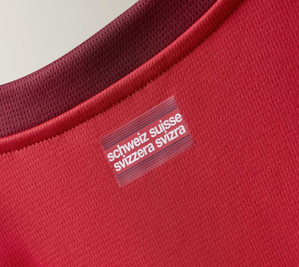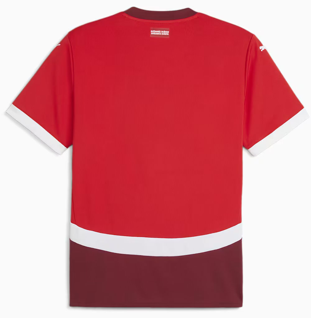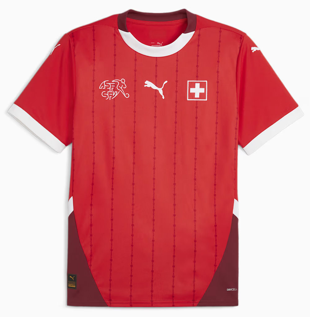 2024新ホームユニフォームは伝統のレッドを基調に、有刺鉄線のようなピンストライプ柄を配置。濃淡レッドとホワイトのコントラストもきれいなデザインだ。左胸にスイス国旗を、右胸に協会エンブレムを付ける。