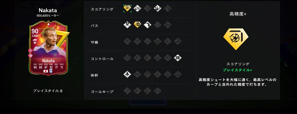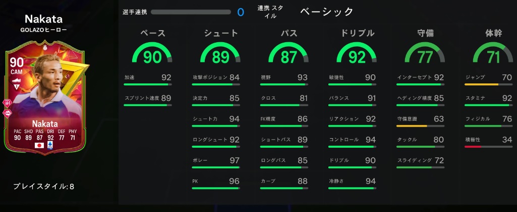 総合値は90で、スピード90、シュート89、パス87、ドリブル92、守備77、体幹71。これは強い…。