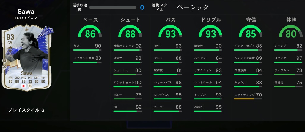 総合値は93!スピード86、シュート88、パス93、ドリブル93、守備85、体幹80。こちらも強い。