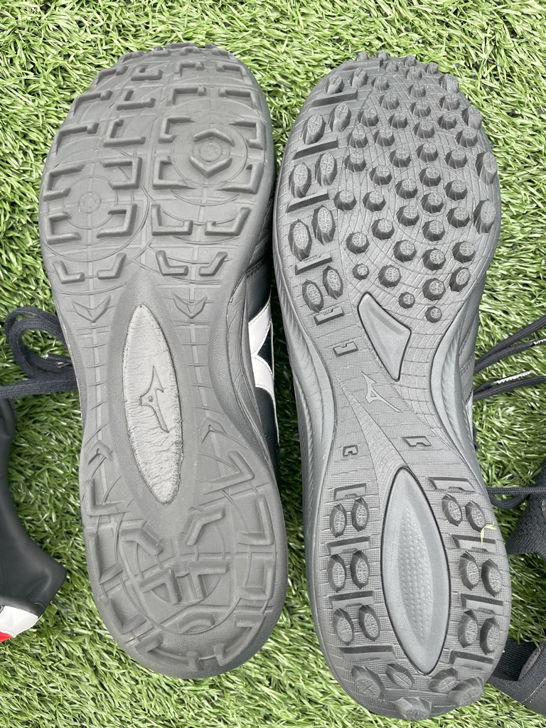 こちらは『モレリア TF』(左)と『モレリア サラ β JAPAN TF』(右)のアウトソールの比較。スタッドの形状は大きく変わった。