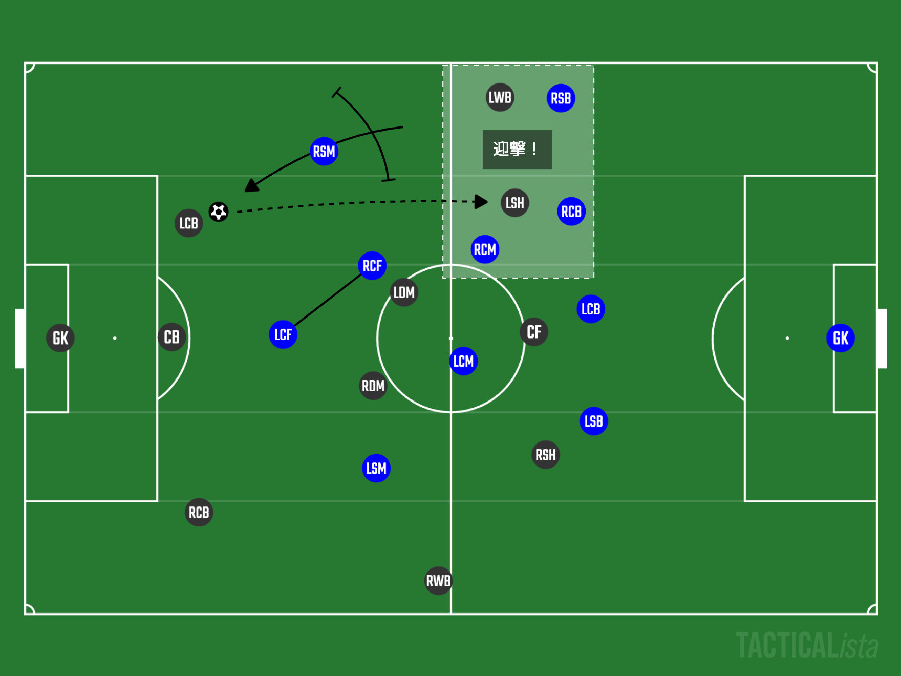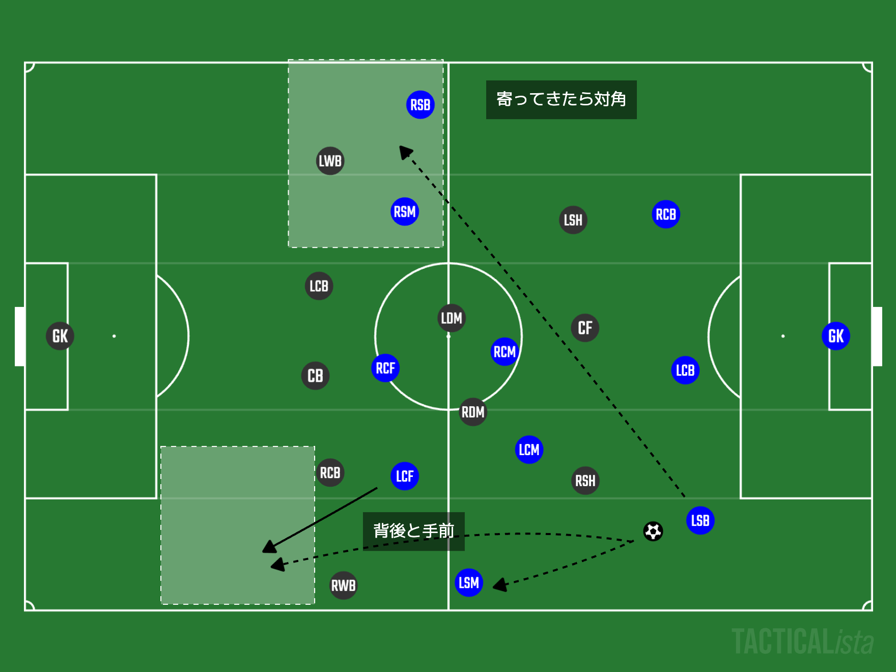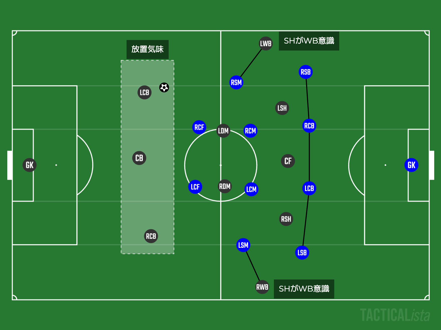 そして町田ゼルビアはSHが外切りを行った時、中央経由/頭上を越えるパスでWBに逃げられた時の対応を突き付けられると思います。