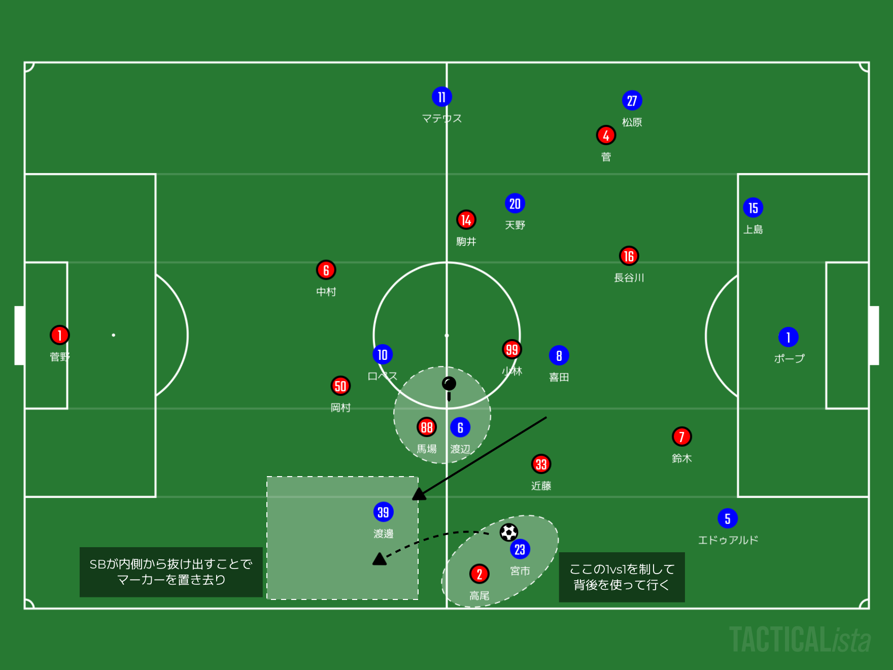 このように小林選手と長谷川選手、鈴木選手が列の入れ替えを行ったことによって、マリノスCBをピン止めしたこと、さらにWBが高い位置をとることによってSBを止めたことにより、喜田選手周辺でボールを引き取れるようになっていました。さらに喜田選手はIHのカバーを常に取り続けるタスクがあるので、視界外から降りてくる小林選手の対応がワンテンポ遅れます。