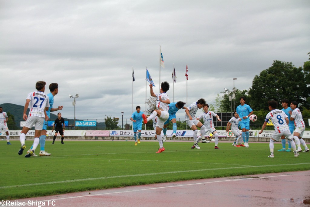 さらに43分には再び平尾壮の左コーナーキックからニアにロメロ・フランクが飛び込み、ヘディングで合わせる。右ポストにあたったシュートがゴールの中に吸い込まれ、レイラック滋賀FCのリードが広がった。
