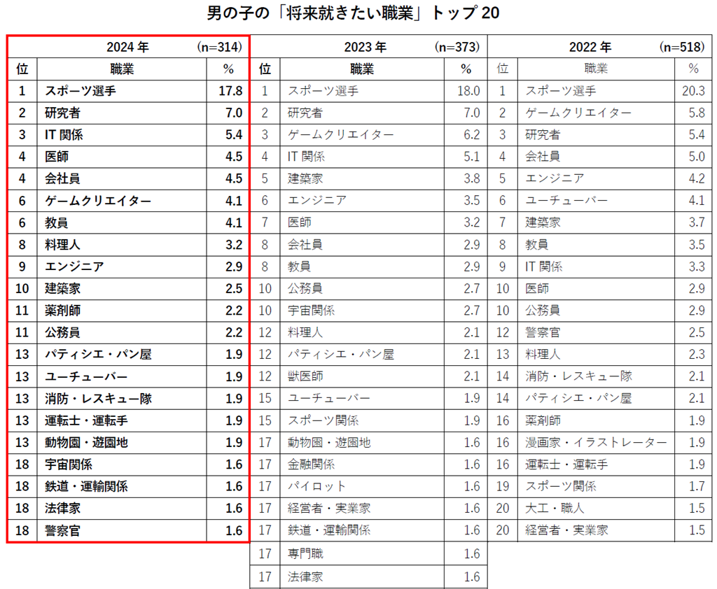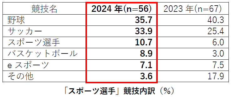 「スポーツ選手」は、男子に圧倒的な人気で、競技内訳ではサッカー、バスケットボールの伸びが目立っている。