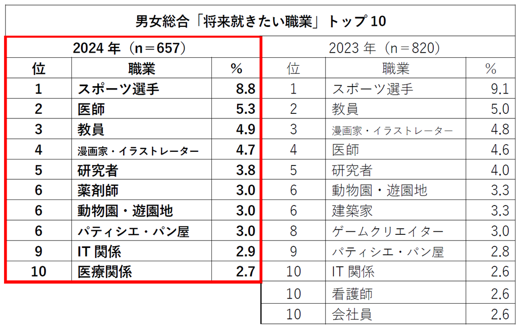 1位は今年も「スポーツ選手」。2位は「医師」、3位は「教員」となった。