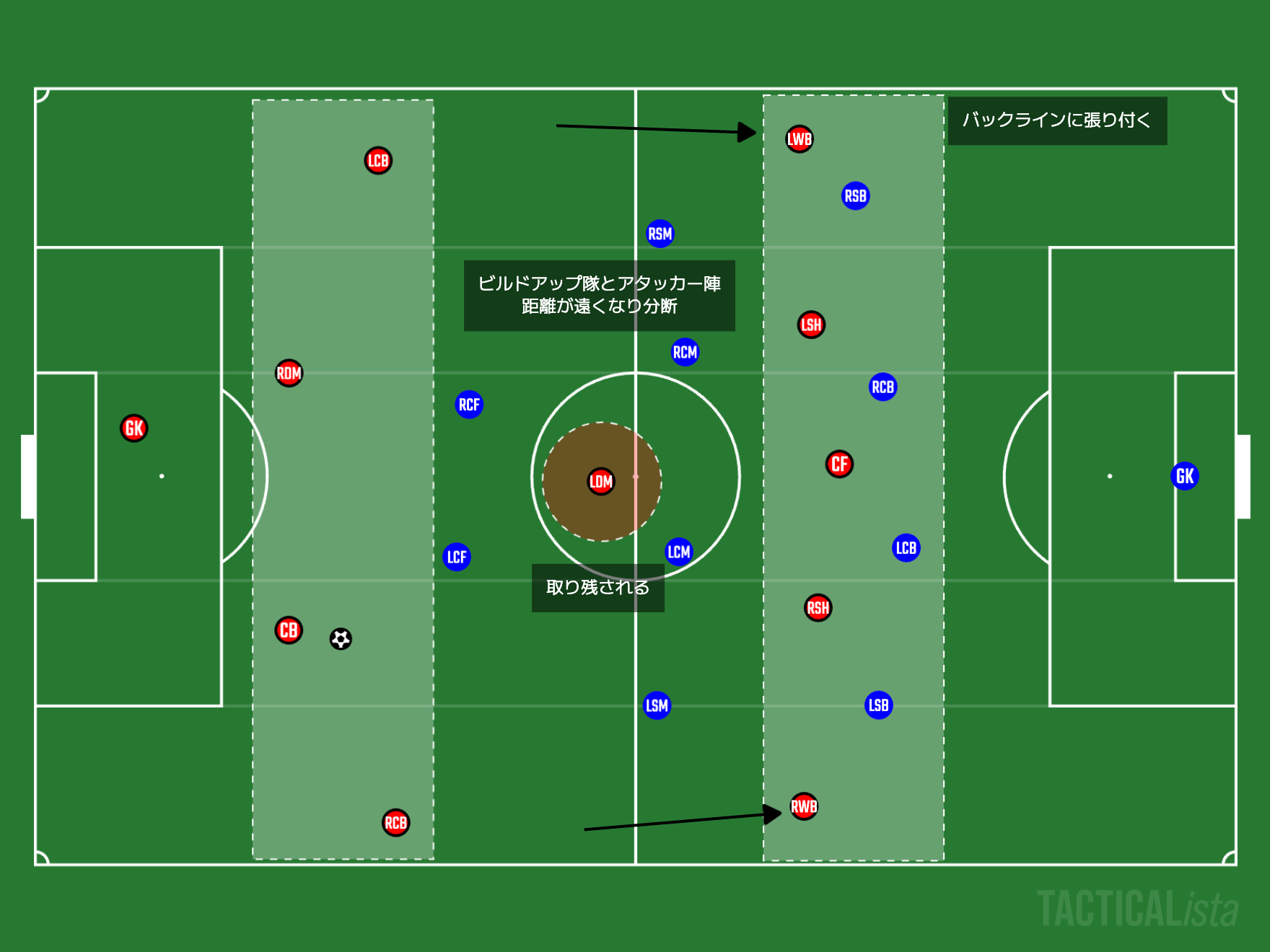 次に2つ目が『最終ラインに張り付くことによる分断』です。3トップと可変によって高い位置を取るWB。この5枚が対戦相手の最終ラインに張り付くことが多くなっていたので、1つ目に述べた空洞化が起きてしまっていました。