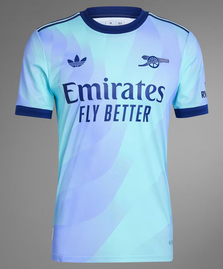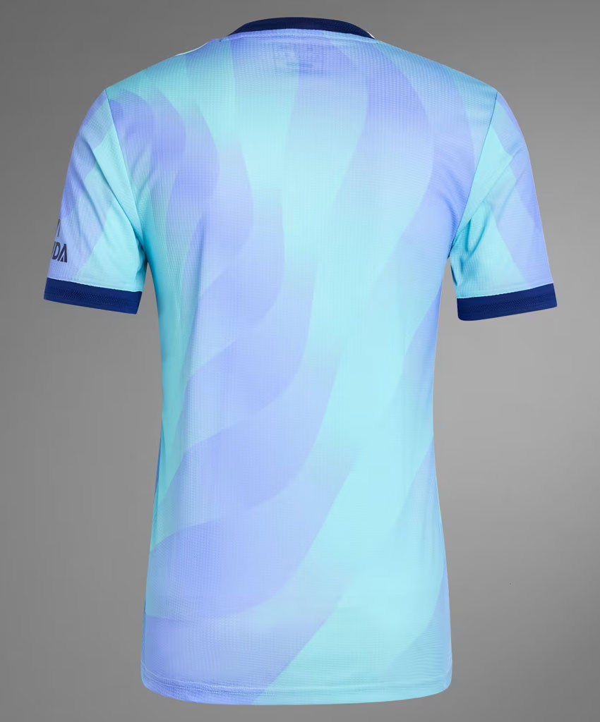 2024-25新サードユニフォームはアクアブルーを基調に、ライトパープルとネイビーの2色によるグラフィックを重ねるデザイン。フィールドプレーヤー用にこの系統のブルーを採用するのは、2017-18シーズンのアウェイユニフォーム以来となる。