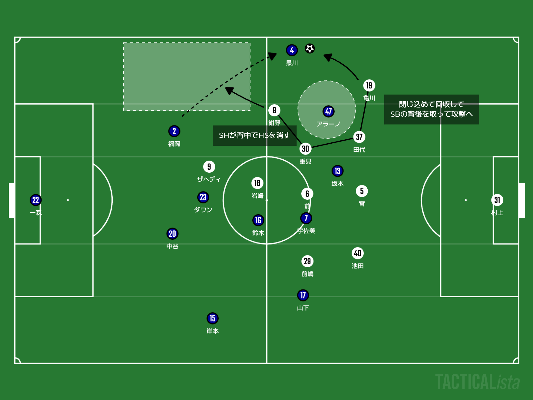 ここでSHはSBまで下がるのではなく、内側に入るSHを背中で消してSB vs SBの構図を狙って作り出していました。これによってアビスパ福岡SBは優位に1vs1に入る事が可能になるので、ボールを回収する事、チーム全体として圧縮していく事が叶っていきます。そして奪ったボールはSBの背後へ送り込みます。この時にSHが下がらず前に対応した事によって、ポジティブトランジションがスムーズになり、一気に崩しに入っていくことができていました。